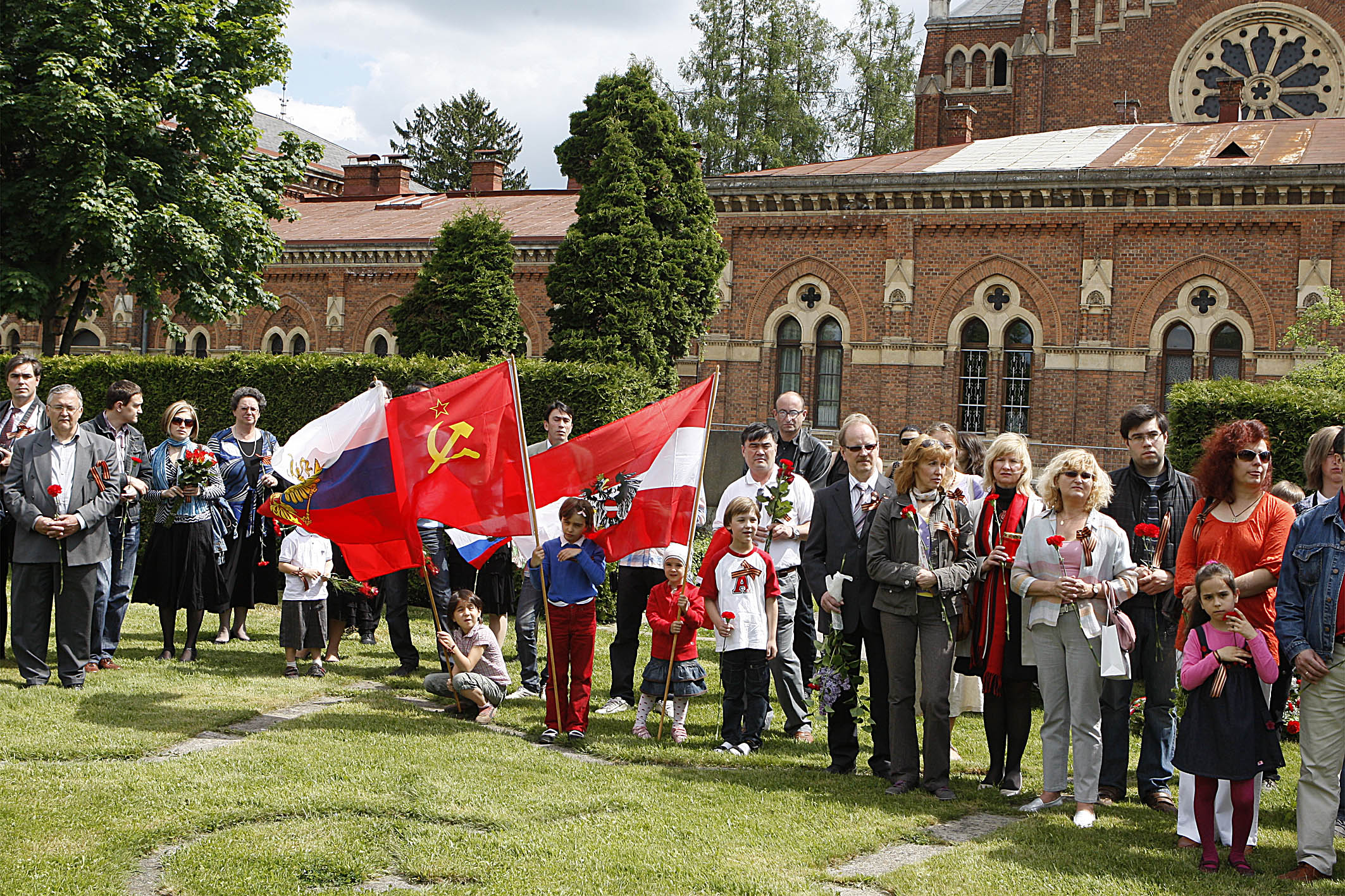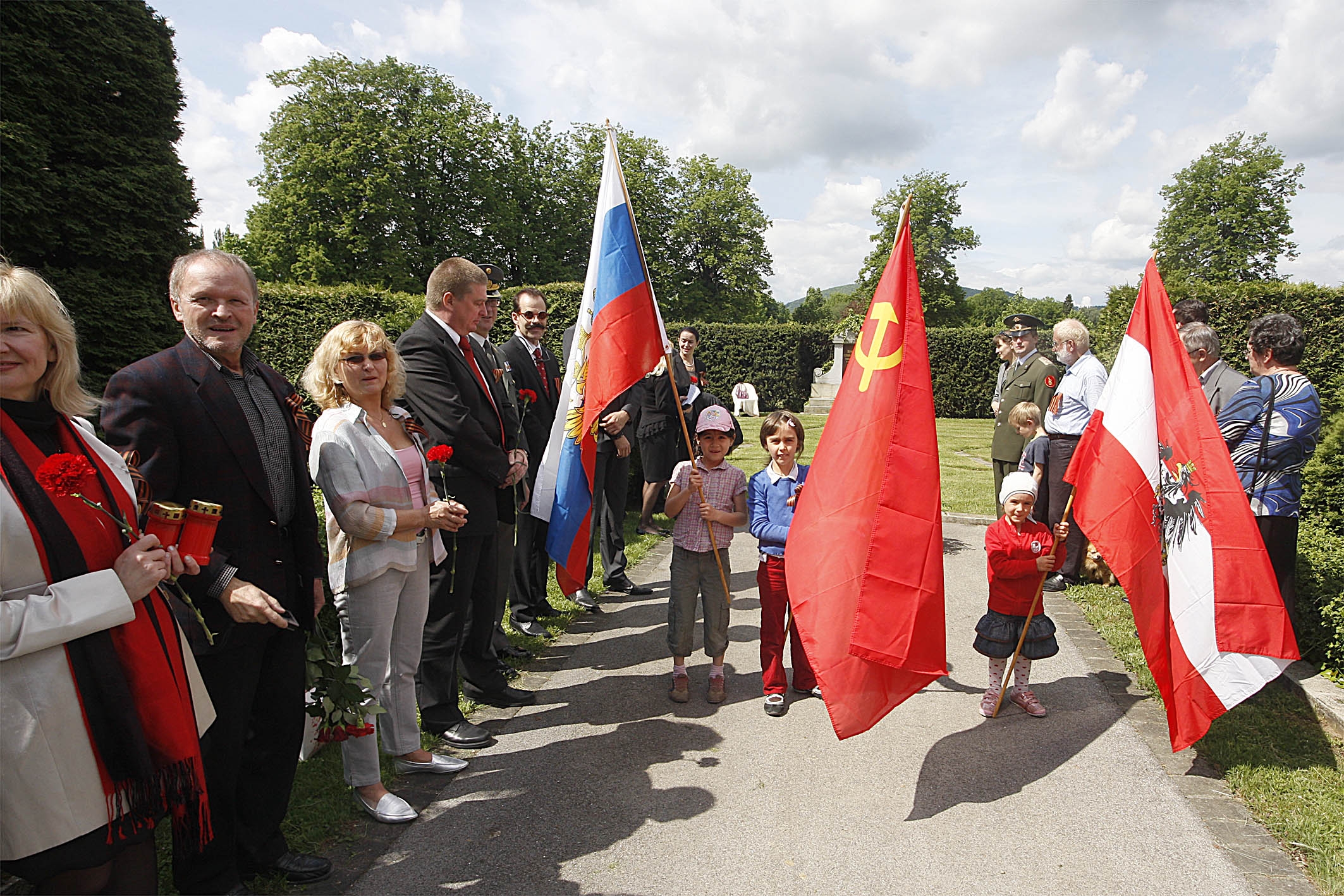 Außerdem war eine etwa 50 Personen umfassende Gruppe von in Österreich lebenden Bürgerinnen und Bürgern aus der ehemaligen UdSSR gekommen, um der im Kampf oder durch andere Kriegseinwirkungen für die Befreiung Österreichs vom Faschismus ums Leben gekommenen Angehörigen der Roten Armee zu gedenken. Die Anwesenden boten ein buntes Bild, es waren alle Altersgruppen vom Kind bis zum ehemaligen Kriegsveteranen mit Fahnen, Blumen und den traditionellen schwarz – orangen Ordensbändern vertreten.
